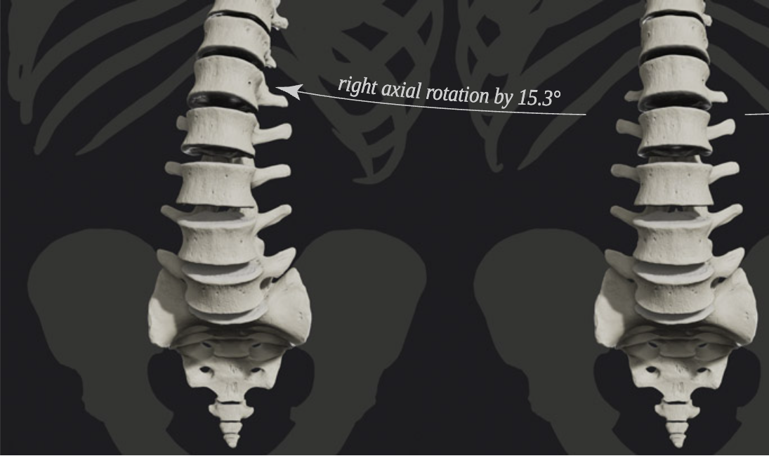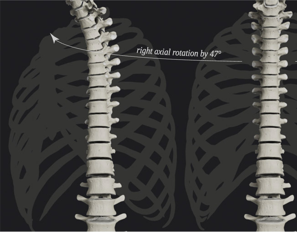 You get 30º more rotation in the thoracic than you do in the lumbar. The lumbar is mostly for support; the thoracic is for rotation. Don’t forget to double that number! 30º rotation in the lumbar total and more than 90 in the thoracic. IF your costovertebral joints are limber.